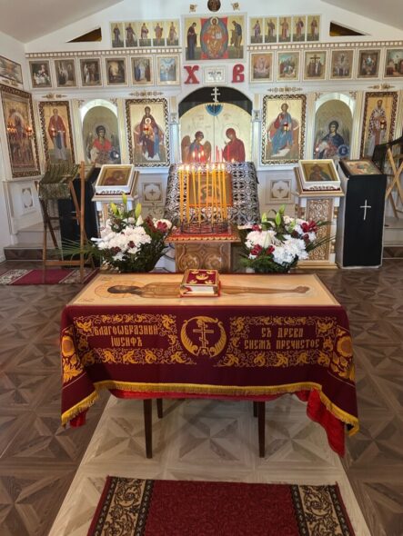 Да молчи́т вся́кая плоть челове́ча, и да стои́т со стра́хом и тре́петом, и ничто́же земно́е в себе́ да помышля́ет: Царь бо ца́рствующих и Госпо́дь госпо́дствующих прихо́дит закла́тися и да́тися в снедь ве́рным. Предхо́дят же сему ли́цы áнгельстии со вся́ким Нача́лом и Вла́стию, многоочи́тии Херуви́ми и шестокрила́тии Серафи́ми, ли́ца закрыва́юще и вопию́ще песнь: Аллилу́иа, аллилу́иа, аллилу́иа.